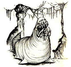The Maze is a complex, partially flooded cave system made of soft white stone. An eerie blue glow lights the caverns, and milky water drips down its walls and hardens into stone, often trapping unsuspecting victims. The Glus uses its sticky spray of white threads to trap prey, build within the Maze, and mend holes. Because of the constant dripping of water and the Glus's method of hunting, the shapes of corpses can often be seen in the Maze walls.[3]