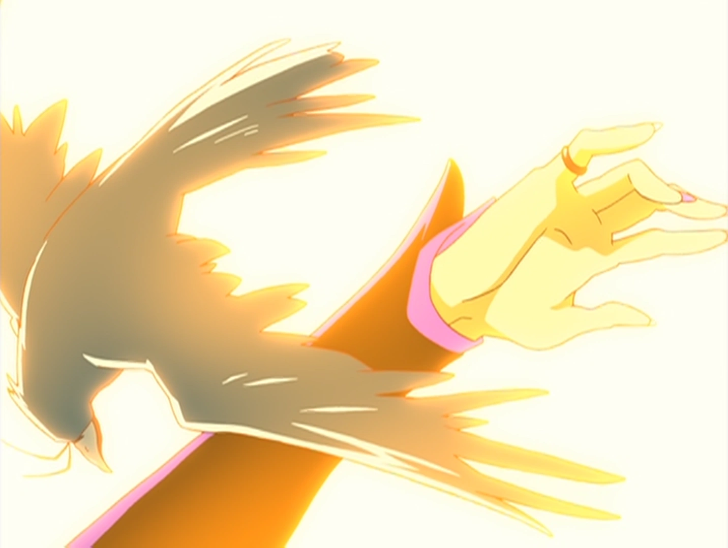- Despite her dislike of birds, in her extended appearances in the anime she is shown transforming into a large bird resembling a monstrous crow with a pink cross on its chest for travel.