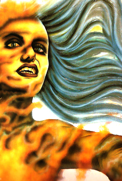 Thaegan was a tall, towering woman with green skin and long, grey hair. Her green skin, which shined like glass, was the result of a magical shield that protected her body from harm. Her real skin was bone-white in colour,[1] as evidenced by the tip of her left little finger, the only part of her body not shielded.[2][1] She had a beautiful face and her blood was dark red. Thaegan's gorgeous appearence seems to be some sort of illusion. Behind her false beauty, she looks like a hideous, deformed witch.[1] Her magic was often accompanied by acrid, yellow smoke,[2] which such as whenever she teleported throughout her territory. When doing so, the sky would seem to split open with a jagged streak of light and the yellow, foul-smelling and choking smoke would belch from the split with her body appearing in the midst of it.[1]