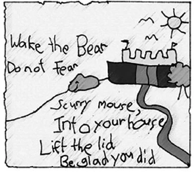 Jasmine leads Lief and Barda to her tree-top home, which happens to be a nest. There Jasmine shares a strange meal of fruit and nuts with Lief and Barda. Lief asks Jasmine how she had come to live alone in the Forests. Jasmine says that when she was seven years old, she was fetching water at the stream when she heard the Grey Guards approaching the home she shared with her parents. Running back, she saw her parents with two Guards. Her mother saw Jasmine and made a sign to her to stay in the ferns and be silent. Then, after the Guards set fire to the house, they left with her parents. Jasmine believed that if she was good and stayed quiet, her parents would come back, but they did not. Lief notices that Jasmine almost cries, and that Jasmine probably has not cried for a long time. She then gathered up any possessions that were not burnt from the house and made a new home in the treetops, and that is how she has lived ever since. Barda asks is she is ever lonely. Jasmine replies that she had the animals and trees to talk to, so she was not lonely. Barda does not believe Jasmine when she says she can talk to trees and animals, and believes she is insane.